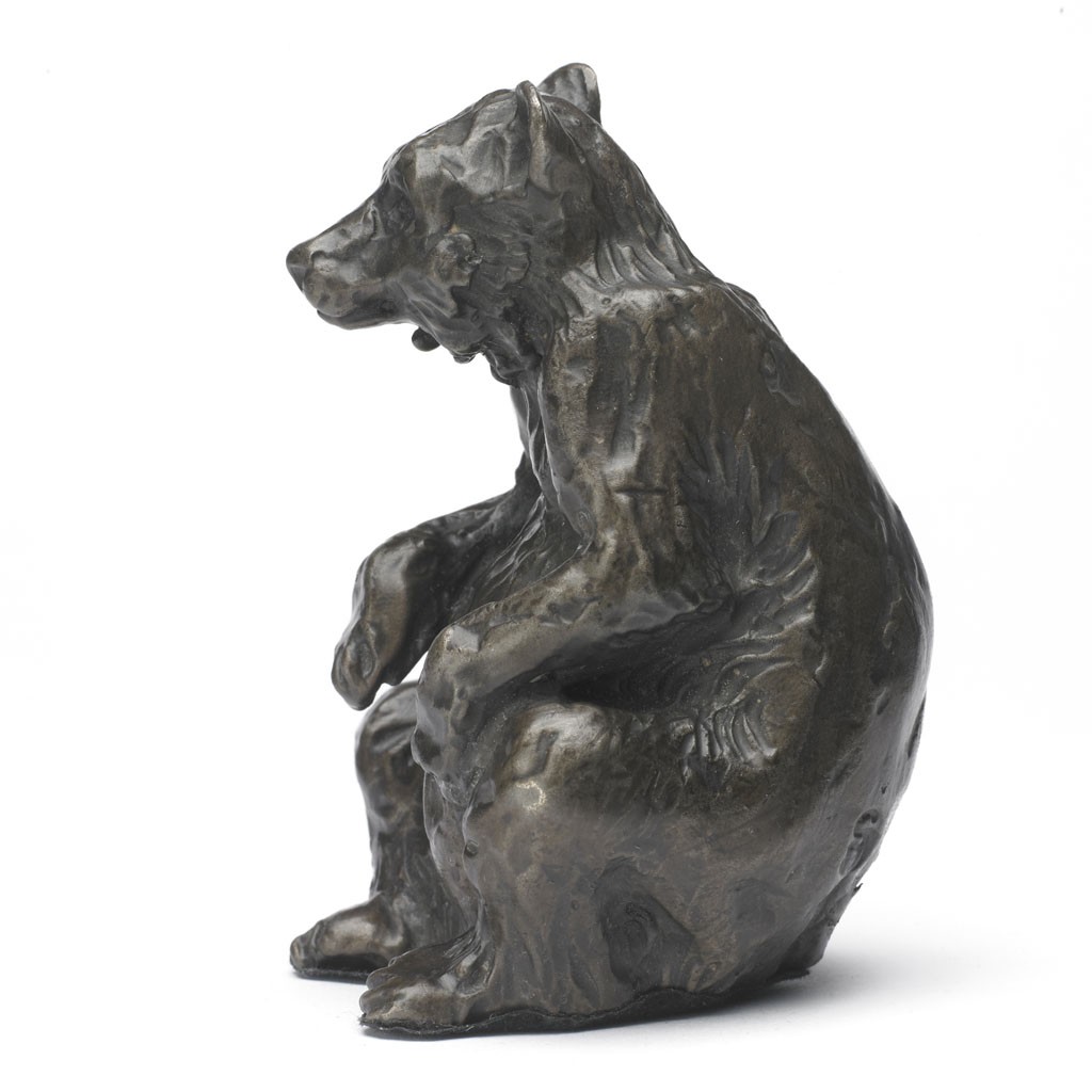 This solid bronze sculpture of a Sue Maclaurin Seated Bear is a foundry casting of her original sculpture and took two weeks to create.