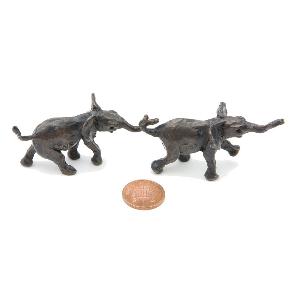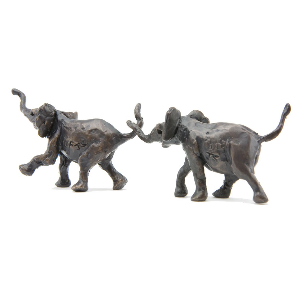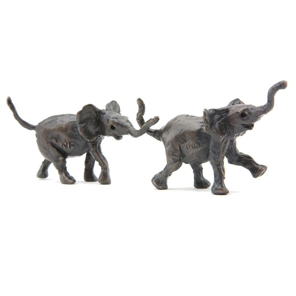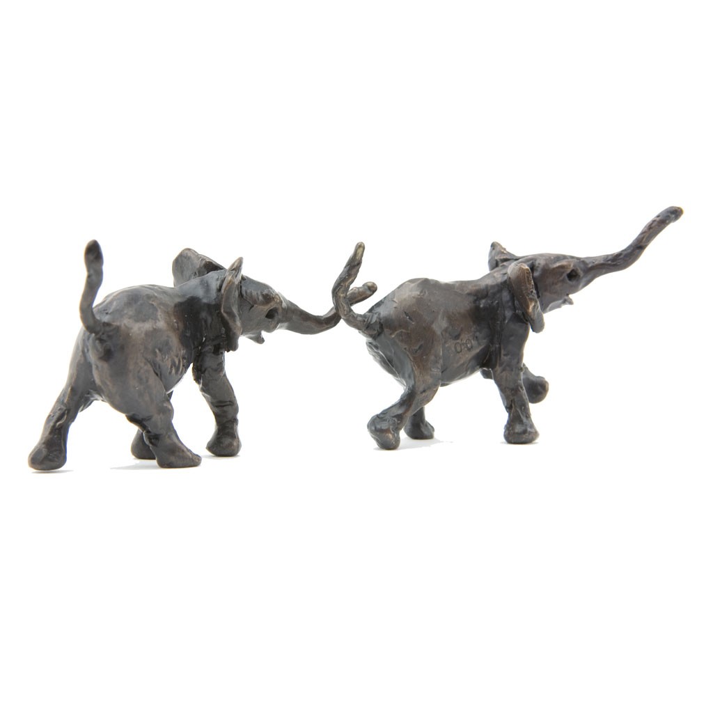 Many thanks for the small bronzes which we are both very pleased with, we laughed out loud at the humour of the situation that they depict. One can almost see the African dust rising from these two young elephants as they charge about, not entirely in control of themselves, especially their trunks. We love elephants generally but the babies are pure magic. We shall keep you in mind for future buys.