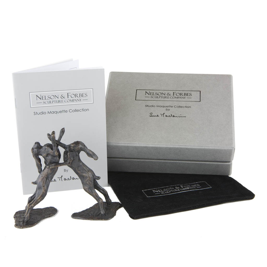 This Sue Maclaurin bronze sculpture, 'Boxing Hares Maquette' was cast by hand in a British foundry by Nelson & Forbes, as limited edition of just 500 castings.  It is part of the Nelson & Forbes ‘Studio Maquette Collection’, which was launched in 2015 following requests by collectors for miniature sculptures that would make ideal gifts.
