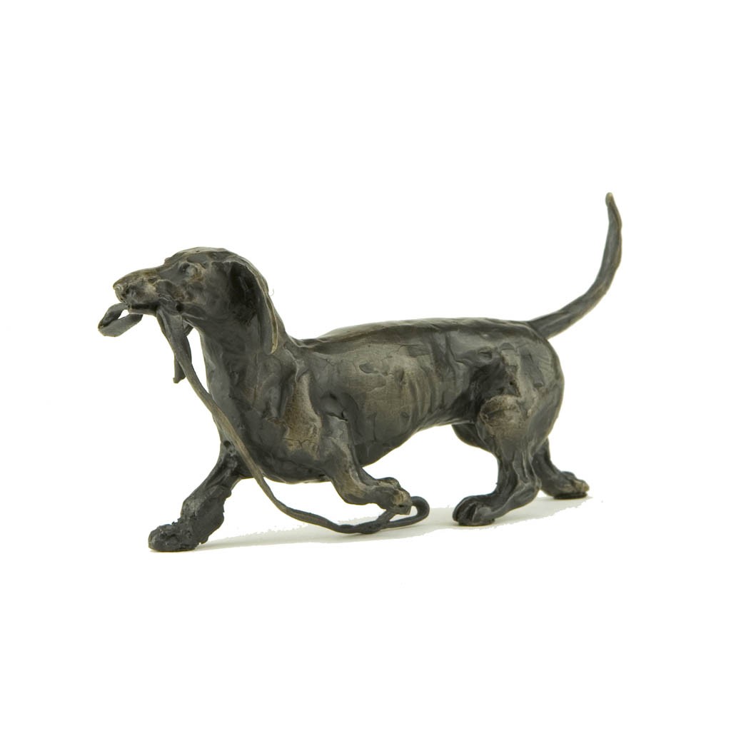 Sue Maclaurin’s gorgeous bronze sculpture of a Trotting Dachshund perfectly captures the cheeky and willful character of these dogs as it scoots along with its lead firmly grasped in its mouth.