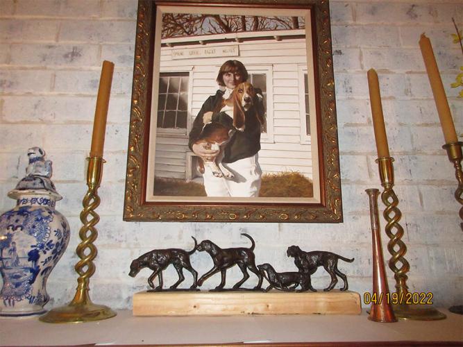 I have included a photo of the three hounds (along with the trotting dachsund), happily parading along on my mantel under an oil painting of Freckles, the Basset Hound, and me, which was painted based on a photo taken of me 48 years ago when I was 17. I was the puppy trainer, a whipper-in, and finally, the Kennel Huntsman for the Spring Creek Basset Hunt in Barrington Hills, Illinois, USA. Basseting involves following the hounds on foot as they chase (in this part of the US) Cottontail Rabbits. They didn't catch the rabbits -- they just "accounted for them" by tracking them to where they went to ground. Some members of the hunt really loved watching hounds working, while others simply used the meet as a chance to go to the teas held afterwards. For me, the draw was the hounds. I have always loved working with animals in groups to watch how they interact. BTW -- the copper and silver horn next to the candlestick was my hunt horn.
