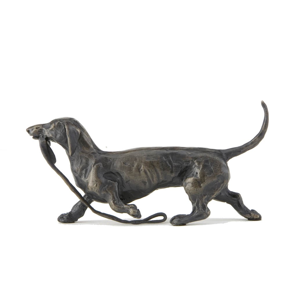 Sue Maclaurin’s gorgeous bronze sculpture of a Trotting Dachshund perfectly captures the cheeky and willful character of these dogs as it scoots along with its lead firmly grasped in its mouth.