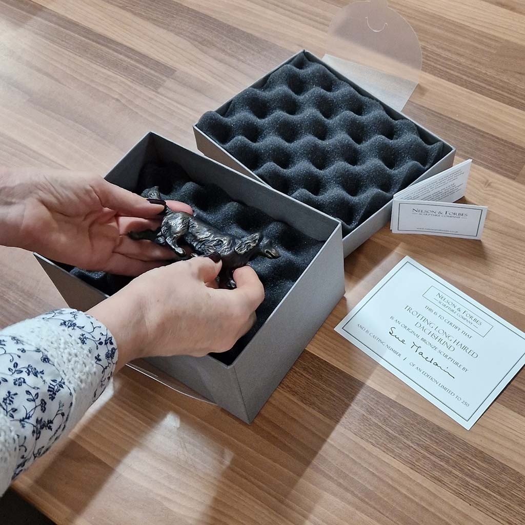 Arriving elegantly presented in our signature, handmade grey gift box, and accompanied by an artist signed and individually numbered certificate of authenticity, Trotting Long Haired Dachshund makes a thoughtful gift, or a quietly distinguished addition to any collection.