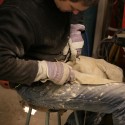 All attached rods and cups (which are now bronze) are removed by hand. At this point, any segments of a large sculpture that has been cast in sections are welded together.
