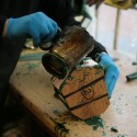 Molten wax is poured into the rubber to create an exact wax duplicate of the original model.