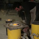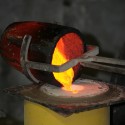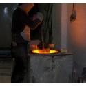 The ceramic mould is removed from the kiln and molten bronze is immediately poured into it, at 1200°C.
