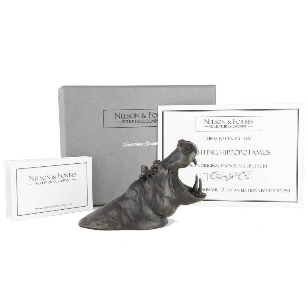This dramatic Jonathan Sanders bronze sculpture 'Fighting Hippopotamus' was cast by hand in a British foundry by Nelson and Forbes, in a limited edition of just 250 castings worldwide. Depicting the mighty hippopotamus as it rears out of the water, Fighting Hippopotamus arrives encased in a beautiful hand made gift box and is accompanied by a numbered certificate of authenticity, signed by the artist, Jonathan Sanders.