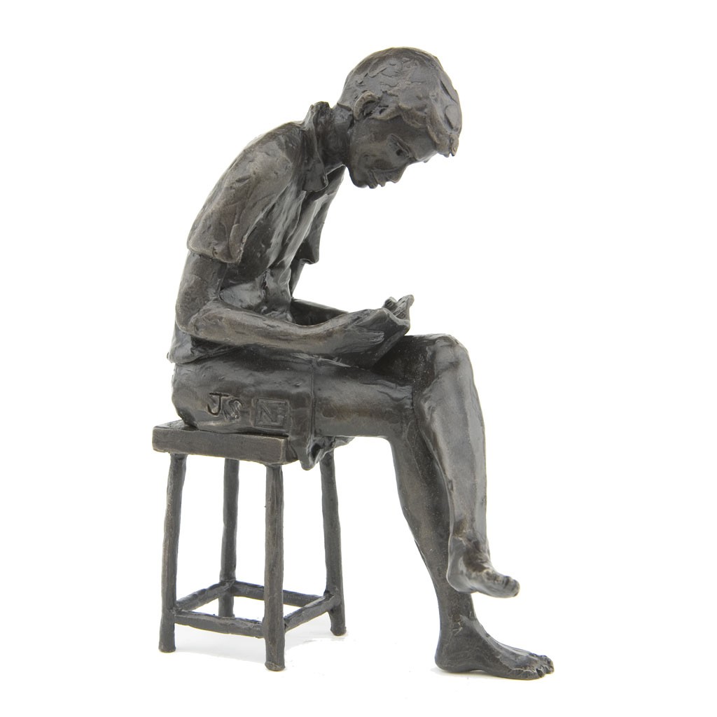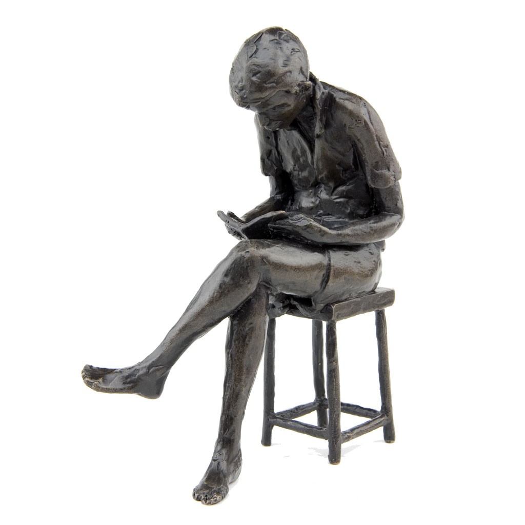 Depicting a boy sitting on a stool and reading a book, the sculpture is presented in a high quality English hand made gift box and is accompanied by a numbered booklet of information, signed by the artist, Jonathan Sanders. The booklet is your guarantee that this is an original foundry casting of Jonathan Sanders's work that he has personally approved.